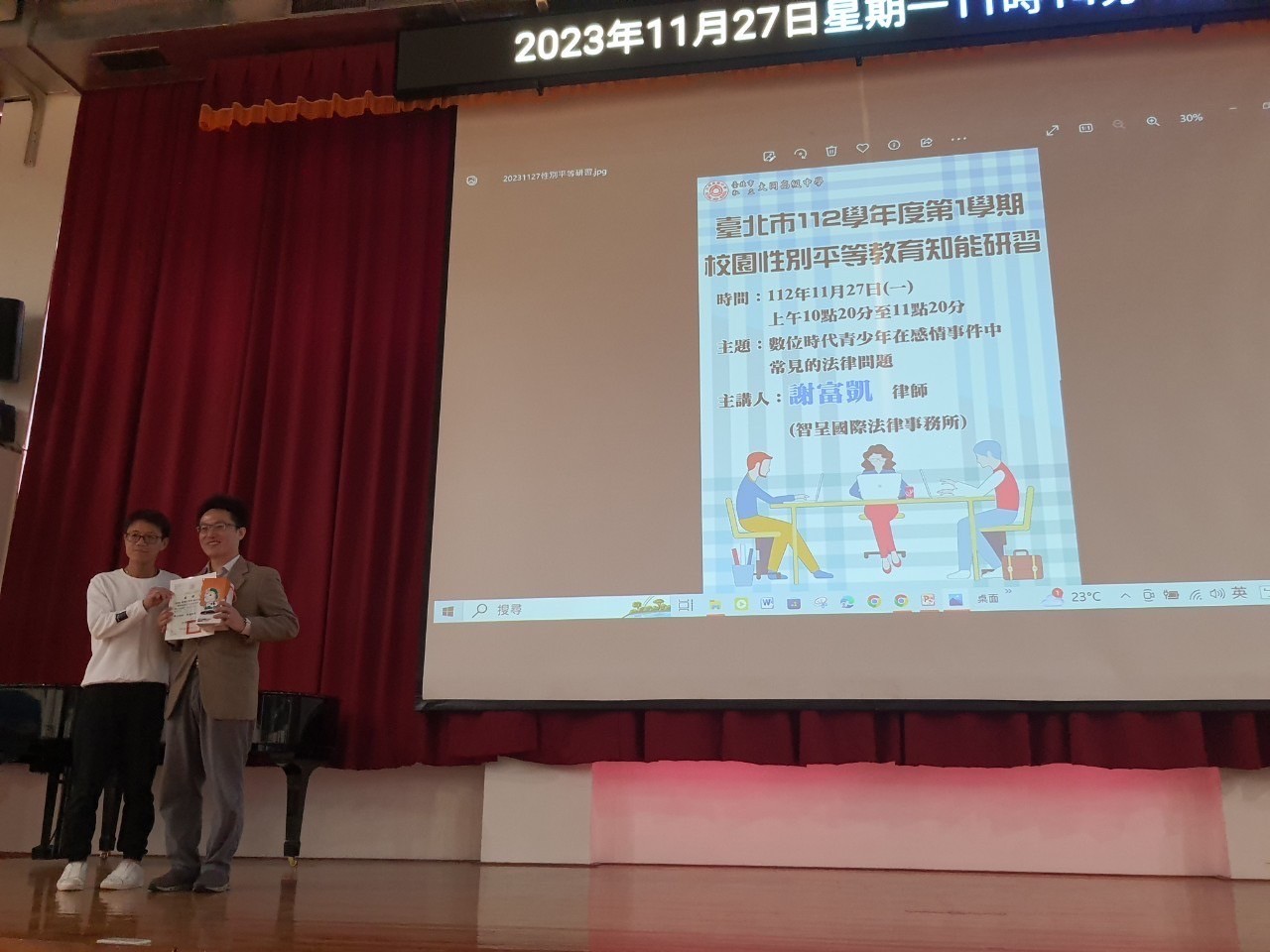 112年05月25日本所謝富凱律師受邀至泰北高中演講「性別平等教育-青少年感情事件中常見的法律問題」。